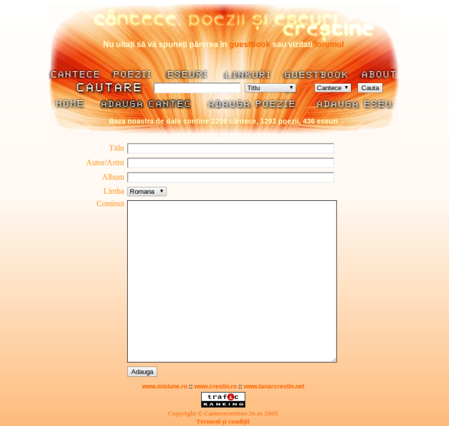 In aprilie 2005 Dumnezeu ne-a pus in inima ideea unei harfe virtuale, un site care sa contina versuri de cantari crestine intr-o forma cat mai usor de folosit si gasit, iar utilizatorii sa poata adauga, de asemenea, versuri pentru a o imbunatati cat mai mult. In timp ce lucram la acest proiect, am hotarat sa includem si poezii si eseuri si astfel a luat nastere site-ul www.cantececrestine.3x.ro - site gazduit gratuit. Oameni doritori de informatii crestine au inceput sa il viziteze, sa il foloseasca, dar bucuria noastra a fost si mai mare cand ei au inceput sa si adauge resurse.
