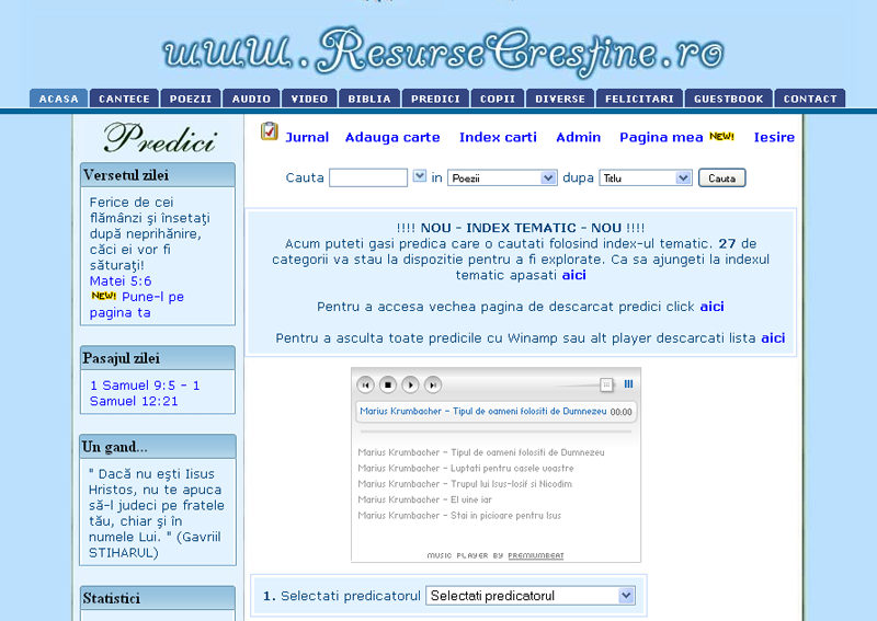 Timpul a trecut, iar Dumnezeu ne-a scos in cale un alt coleg, care a venit incarcat de resurse audio si video, adunate de el in timp si pe care voia cumva sa le puna la dispozitia cat mai multor oameni. Tot atunci am reusit sa dispunem de mai mult spatiu ca sa putem adauga si resursele audio pe site. Au urmat sistemul de utilizatori si, in mai 2007, concursul biblic - cu premii oferite de edituri crestine partenere, odata cu primele resurse video. Am imbunatatit metodele prin care resursele audio puteau fi descarcate si ascultate online. A fost adaugata posibilitatea ascultarii resurselor audio si prin liste Winamp.